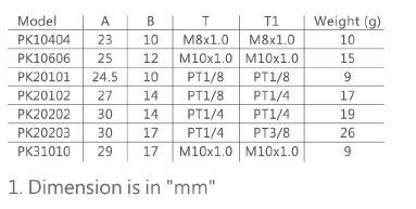 - Thread Size: Various (e.g., M8x1.0, M10x1.0, PT1/8, PT1/4, PT3/8)